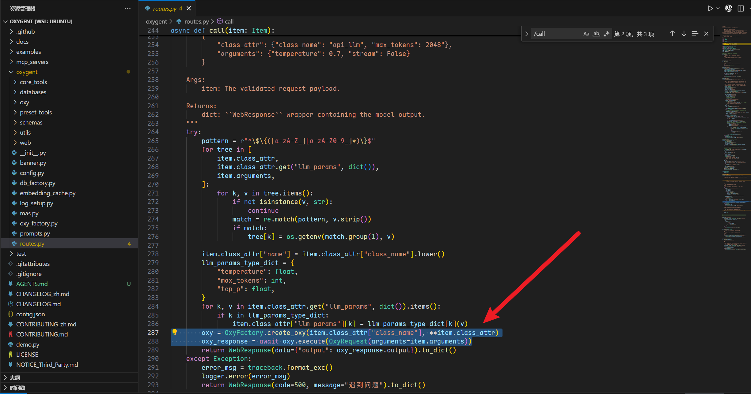 oxygent/routes.py:288构造OxyRequest后调用实例方法execute(...)。因为