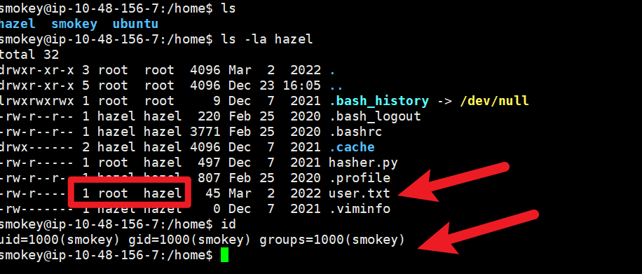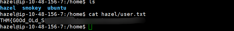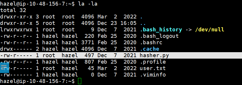 发现 user.txt 在用户 hazel 目录下面,但是只有 root 和 hazel 用户组可以读取。