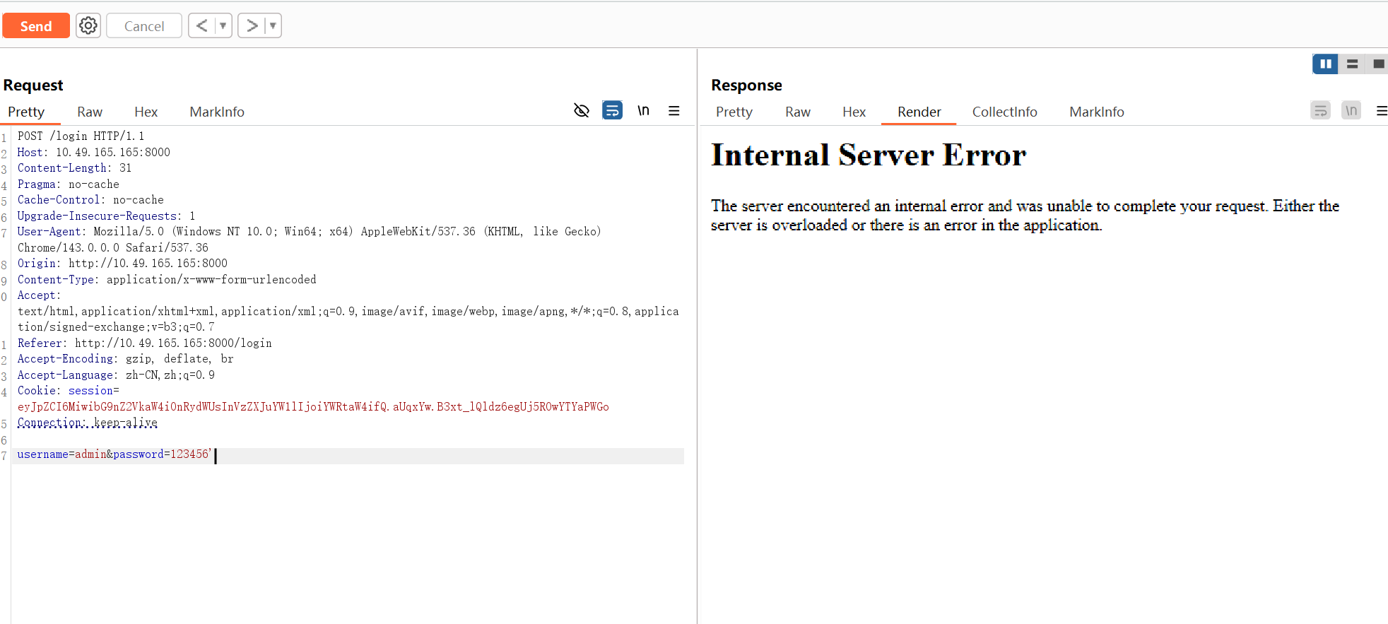 抓一下原登录成功的登陆包,可以经典的 单个单引号报错,一对双引号正常。那大概率就是有 SQL 注入了。