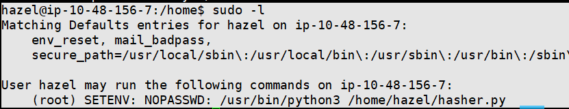 hazel 可以在不输密码的情况下,以 root 身份运行 python3 执行 /home/hazel/hasher.py,并且允许自定义环境变量(SETENV)。