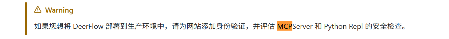 虽然开发者存在提醒: 部署在生产环境时需要评估 MCPServer 和 Python Repl 的安全检查,但是此漏洞危害产生不在接入的 MCP Server 的安全性问题,而是由此项目本身的 MCP 支持功能组件触发,不需要合法的 MCP 服务器。 漏洞触发位置为 MCP Client