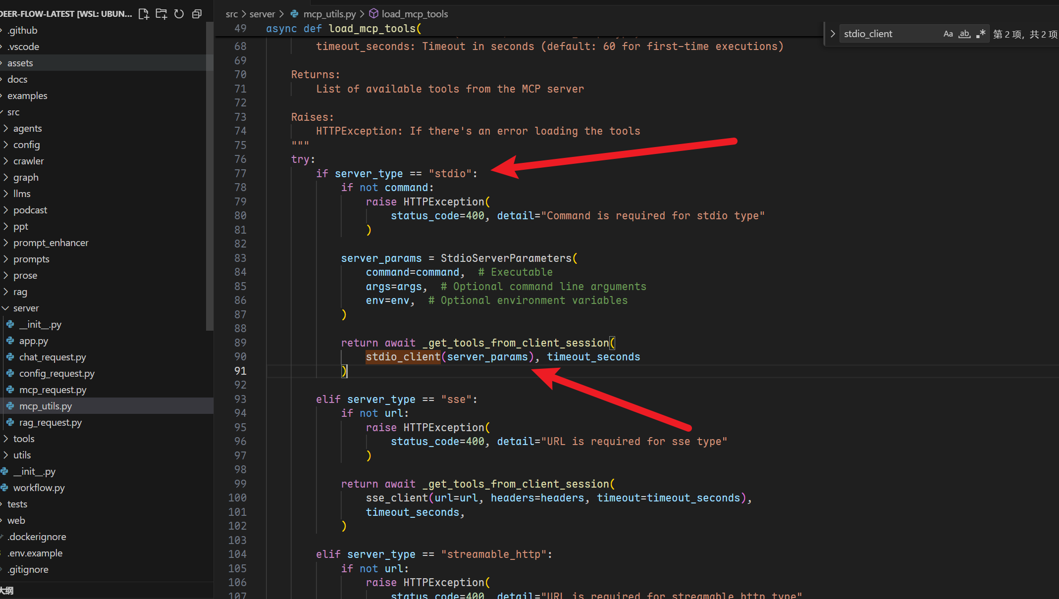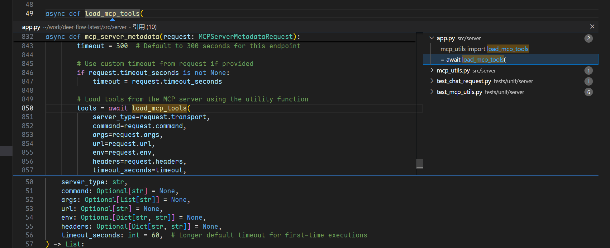 我们进行引用搜索 load_mcp_tools 函数用法,可得到入口在 src/server/app.py:831