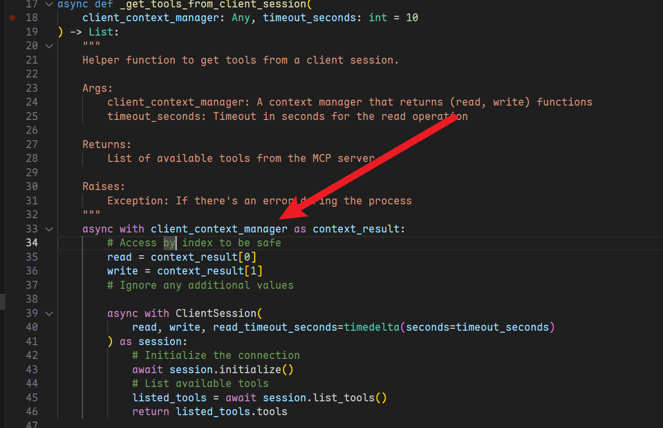 在 src/server/mcp_utils.py:89,以返回的上下文管理器 stdio_client(...) 调用 _get_tools_from_client_session。